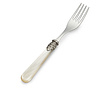 The handle is made of metal acrylic. It is a hard plastic (similar to plexiglass). It is heat resistant and very strong material. Ideal for cutlery. The cutlery can be washed in the dishwasher by using these high-quality materials.